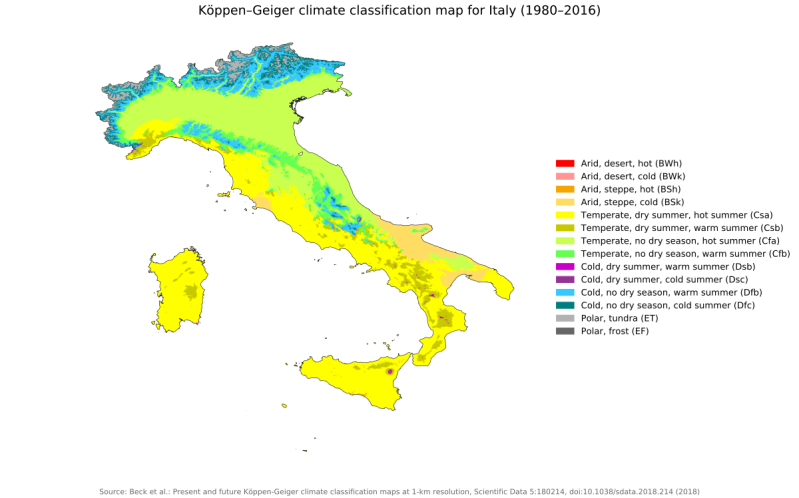 The northernmost part of Italy, where the lower limit of the Alps is located, has partly a high mountain climate and in lower parts a transition climate.